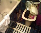 Visualisation du dessous de la baignoire : nous constatons un manque d’etancheite au niveau d’un raccord de la bonde de fond.